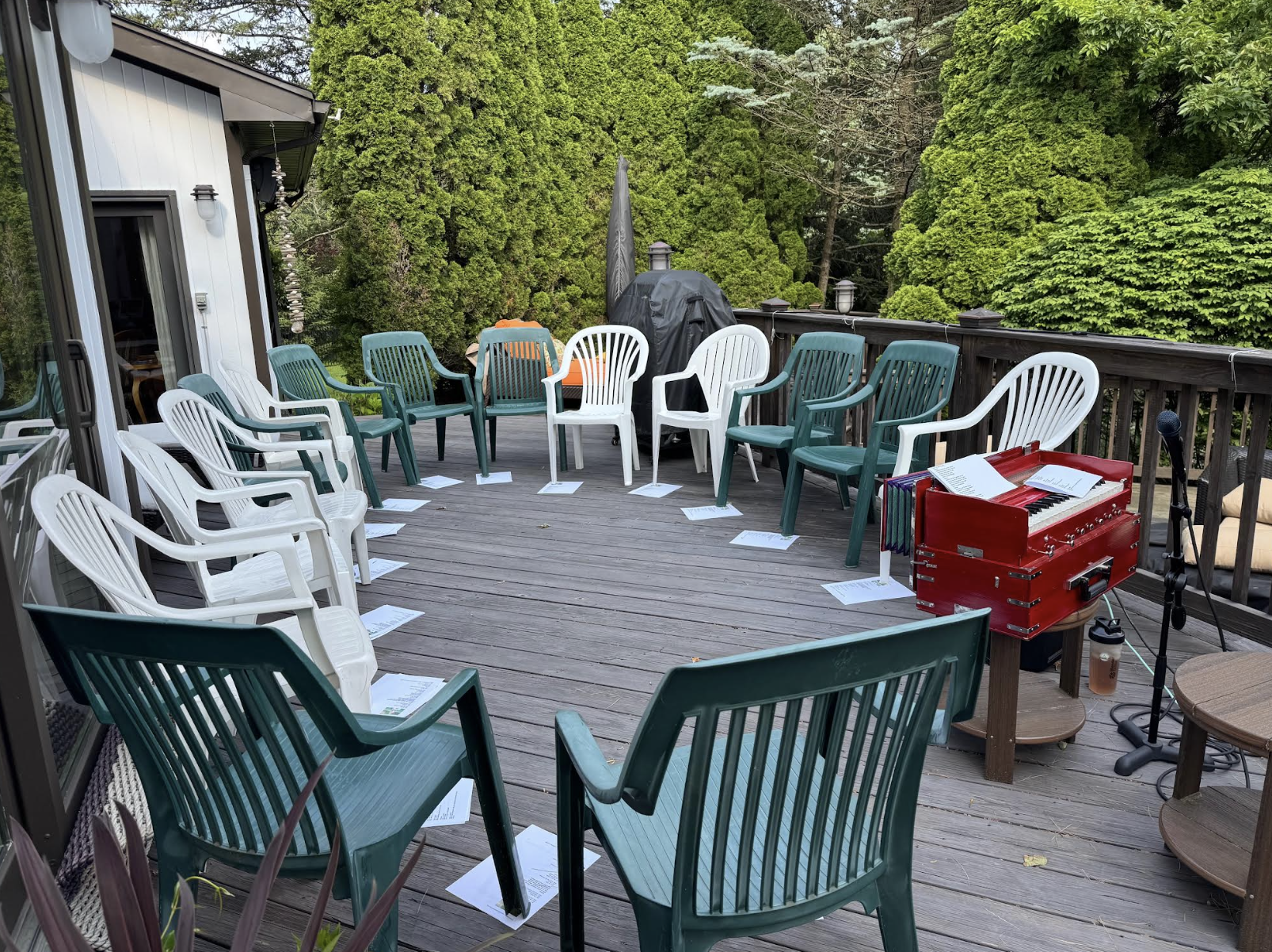 Early on the evening of June 11th, the Universe held us with grace, offering the perfect balmy, rain-free setting for our outdoor chanting session on Deb’s beautiful deck. We arranged 15 chairs in a circle, intentionally creating a safe space for presence, awareness, and deep connection to emerge.